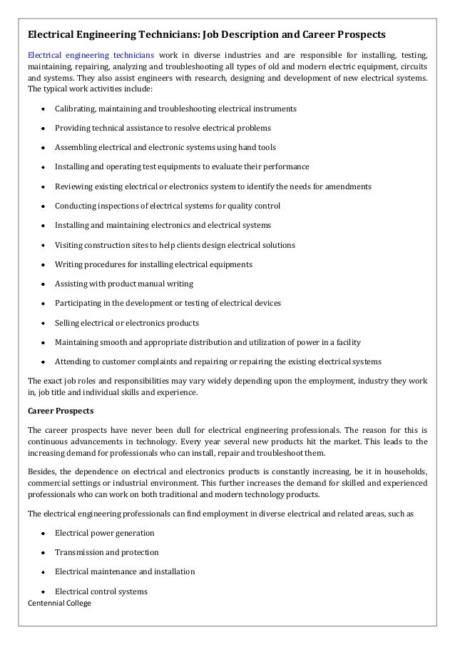 Some may also be involved in installation and quality control. You can make sure you’re attracting the highest quality candidates to your company by composing a rock-solid electrical engineer job description. This free electrical engineer job description sample template can help you attract an innovative and experienced electrical engineer to your company. We make the hiring process one step easier by giving you a template to simply post to our site. Make sure to add requirements, benefits, and perks specific to the role and your company.